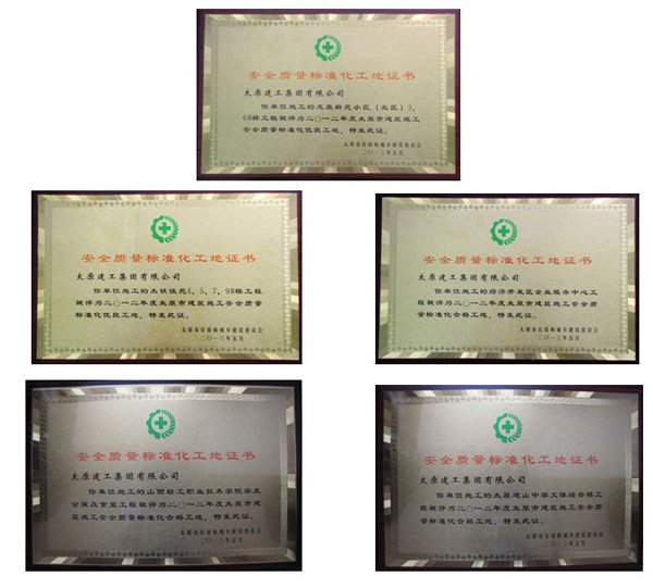 集團(tuán)公司承建的太鐵佳苑4#、5#、7#、9#樓、龍康新苑小區(qū)(北區(qū))3#、6#樓被評(píng)為二0一二年度太原市建筑施工安全質(zhì)量標(biāo)準(zhǔn)化優(yōu)良工地,山西輕工職業(yè)技術(shù)學(xué)院學(xué)生公寓及食堂、太原進(jìn)山中學(xué)文體綜合樓、經(jīng)濟(jì)開發(fā)區(qū)企業(yè)服務(wù)中心被評(píng)為二0一二年度太原市建筑施工安全質(zhì)量標(biāo)準(zhǔn)化合格工地。